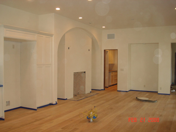 Island goes where wires are, fridge behind it; arched eating area with fireplace. We will not have a traditional dining room.