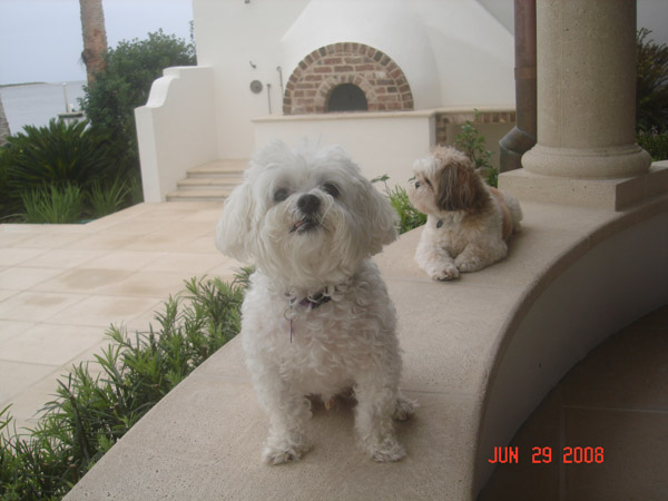 Spike in the foreground and Cinnamon; an outdoor pizza oven and shower in the background. You can tell which is more important.