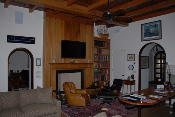 Opposite John's desk, toward the front door and great room. His USAFA saber is over the left door. In case of attack by pirates, we're armed. One child asked if John was a knight when he saw it.